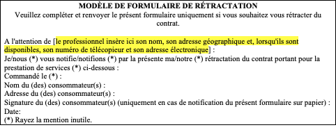 Cessation du Service en cas d’exercice. L'exercice du droit de rétractation met fin à l'obligation des parties soit d'exécuter le contrat soit de le conclure lorsque le consommateur a fait une offre. L'exercice du droit de rétractation d'un contrat principal met automatiquement fin à tout contrat accessoire, sans frais pour le consommateur autres que ceux prévus par la loi. Le Client est donc informé que la Société cessera immédiatement le Service en cas d’exercice du droit de rétractation.
