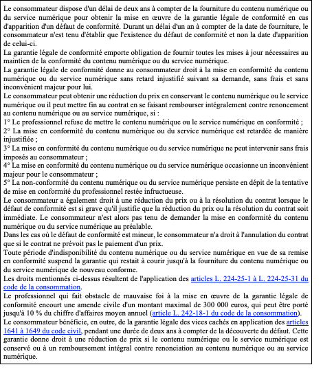 LE CLIENT EST EXPRESSÉMENT INFORMÉ QUE CETTE GARANTIE NE S’APPLIQUE PAS AUX CLIENTS PROFESSIONNELS ET AUX SERVICES AUTRES QUE LES SERVICES NUMÉRIQUES, QUE LE PROFESSIONNEL UTILISE OU NON DES FORMATS OU DES MOYENS NUMÉRIQUES POUR CRÉER LE PRODUIT DU SERVICE, LE FOURNIR OU LE TRANSMETTRE AU CONSOMMATEUR.